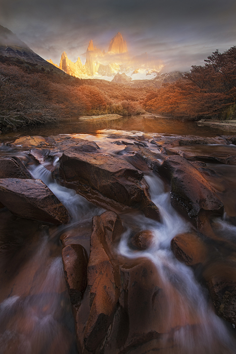 One afternoon, after completing my photography shooting near Poincenot camp-site, I decided to look for new locations near Laguna Capri. I hiked 6 km to Capri camp-site, set up my tent, and then went in search of new locations. From a vantage point at a cliff's edge, I discovered a small waterfall hidden in the forest. Although I already knew the creek and the valley from my topographic map, the waterfall was not marked at all. Early morning, I returned to this location and captured a dramatic sunrise (see photo below).